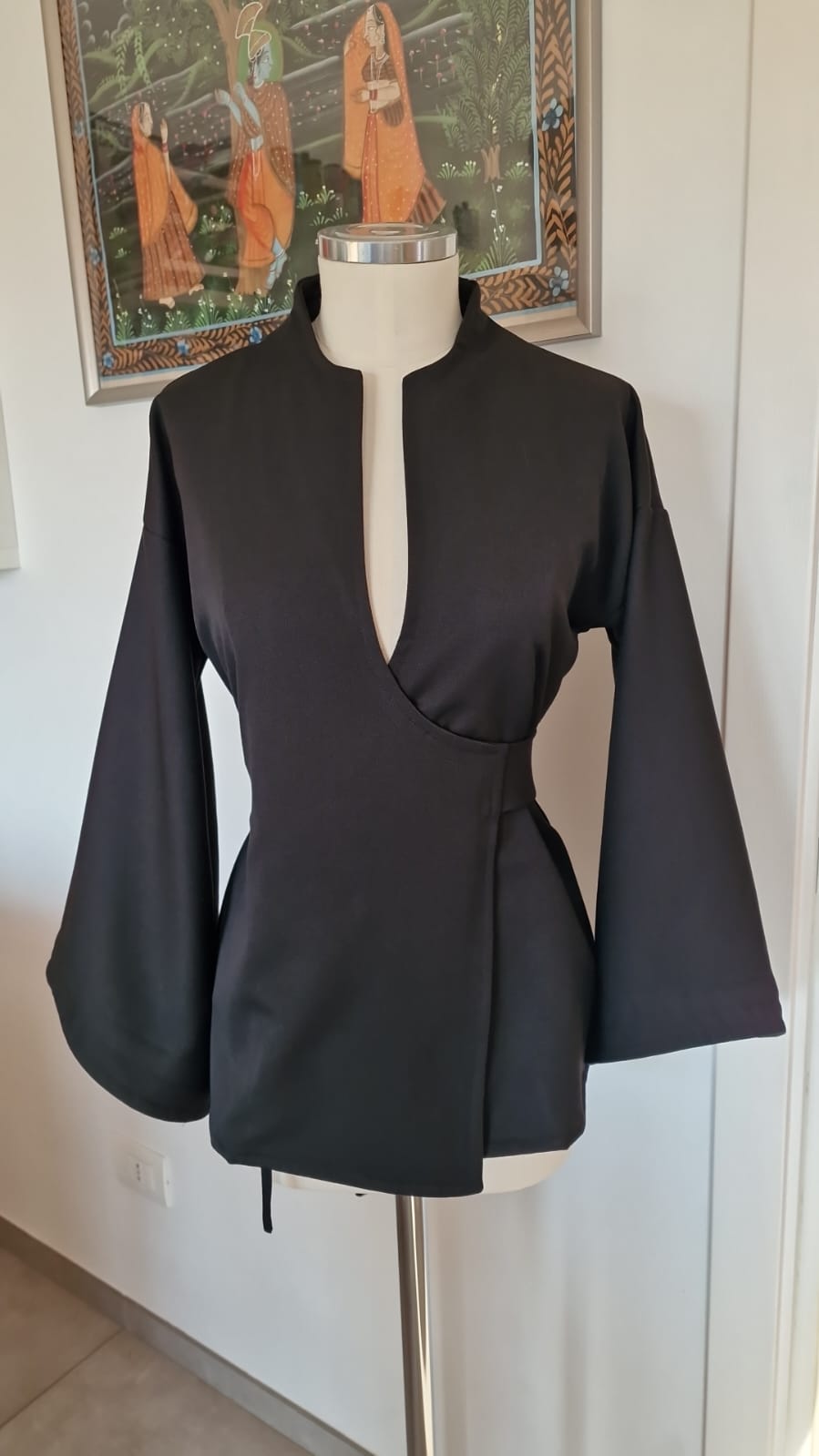 La manica a kimono, elemento iconico del capo, si apre delicatamente sul fondo regalando movimento e leggerezza. Il suo design asimmetrico – più corta sul lato esterno e più lunga verso il corpo – crea un effetto dinamico e raffinato, che dona personalità al capo e lo rende unico nel suo genere.