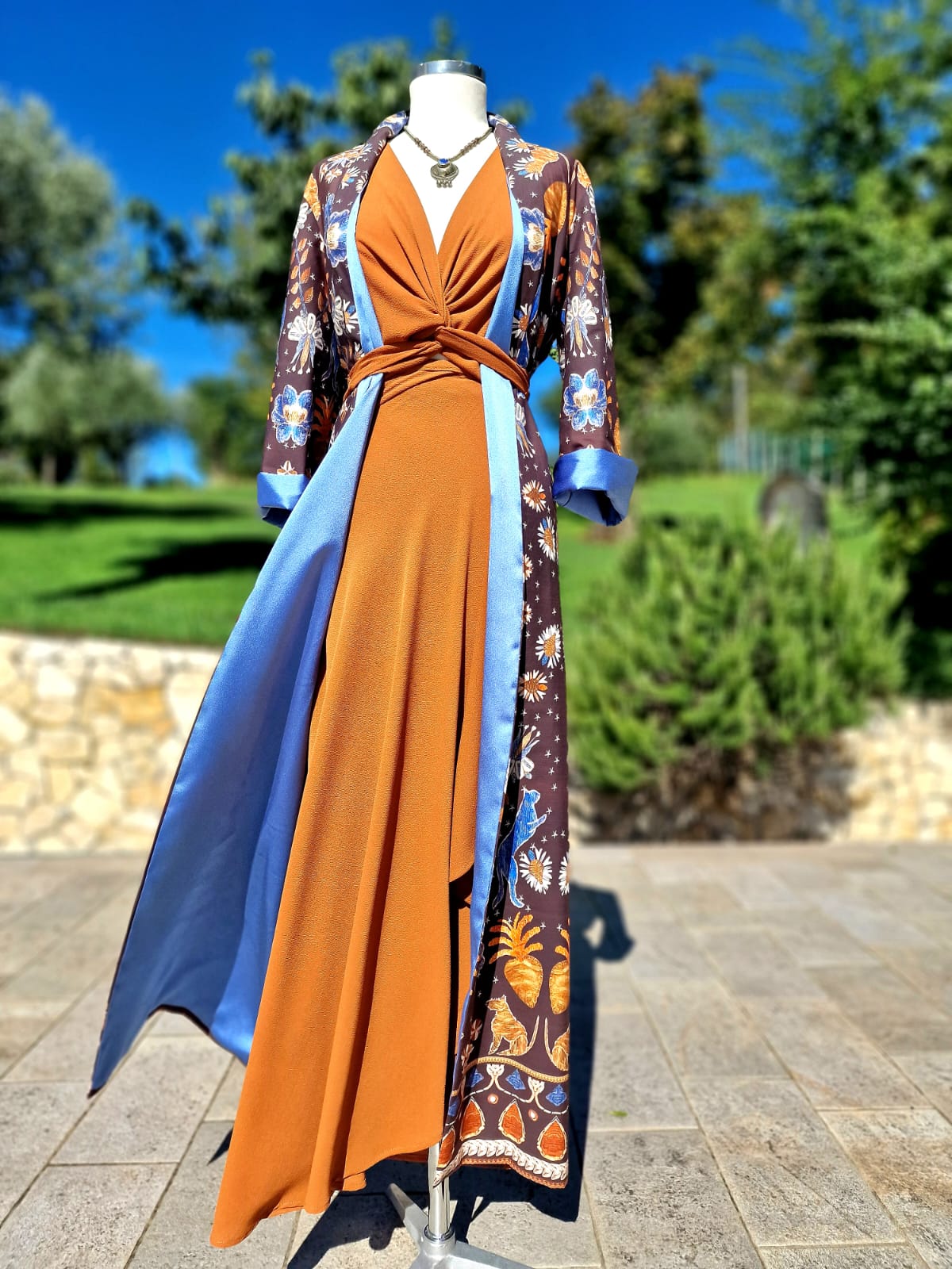 Questo spolverino rappresenta l’unione perfetta tra raffinatezza, versatilità e carattere. Con la sua lunghezza che sfiora le caviglie, regala immediatamente un senso di autorevolezza e femminilità, richiamando l’immagine delle antiche dee e sacerdotesse, simbolo di forza, grazia e mistero. Il design elegante e senza tempo consente di indossarlo in due modi distinti: come una giacca dal taglio fluido e avvolgente o come un abito dall’appeal sofisticato, pronto ad accompagnarti con disinvoltura in ogni occasione.